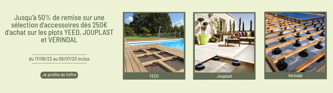 En effet, pour l'achat de plots terrasse des marques YEED, Jouplast ou Vérindal, profitez d'une réduction jusqu'à -50% sur les accessoires associés. Cette remise s'effectue automatiquement dans votre panier, à partir de 250€ d'achat.