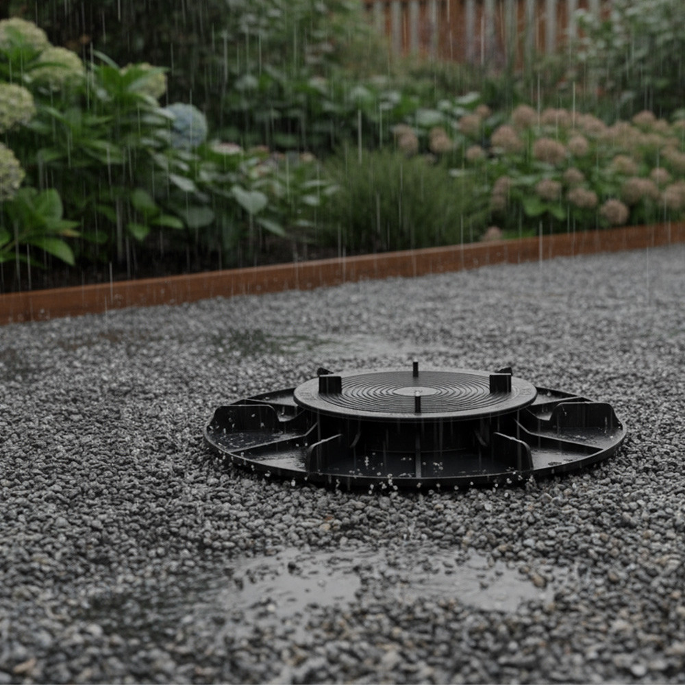 Les ergots présents sur la tête des plots vous permettent de stabiliser les dalles sans aucune fixation et de réaliser naturellement une pose uniforme des dalles en les espaçant de 3 mm. Les joints sont laissés ouverts afin de faciliter l'évacuation des eaux.